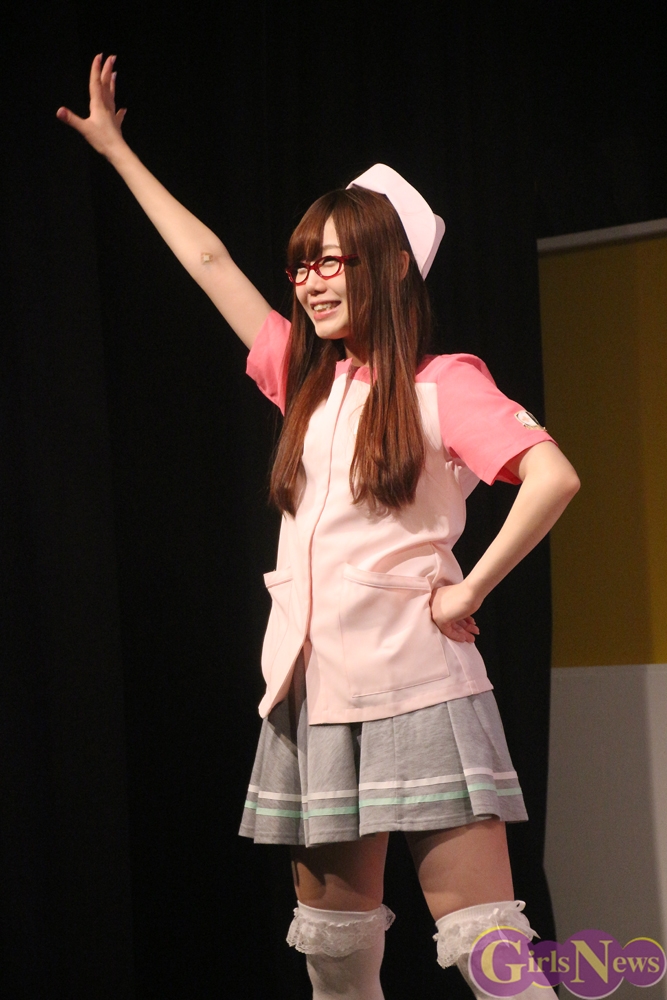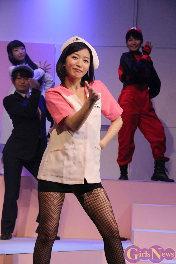 原望奈美さんは「フツーのナース服とは違って、近未来のナースとレスキューを混ぜた感じで。ナースキャップも初めてで、踊っている時に取れないように自分で工夫をして頭に付けています。」と衣装を紹介し「似合ってる?」と今出舞さんに聞くと「フツーですね(笑)あんまり褒めると調子に乗っちゃうんで。」とからかわれていた。
