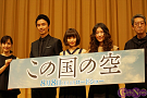 7月16日、映画『この国の空』の完成披露試写会が都内で行われ、二階堂ふみ・長谷川博己・工藤夕貴・富田靖子、そして荒井晴彦監督が舞台挨拶に登壇した。