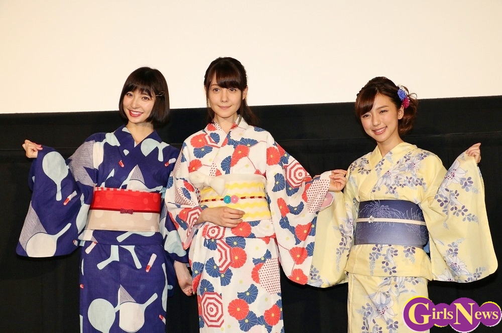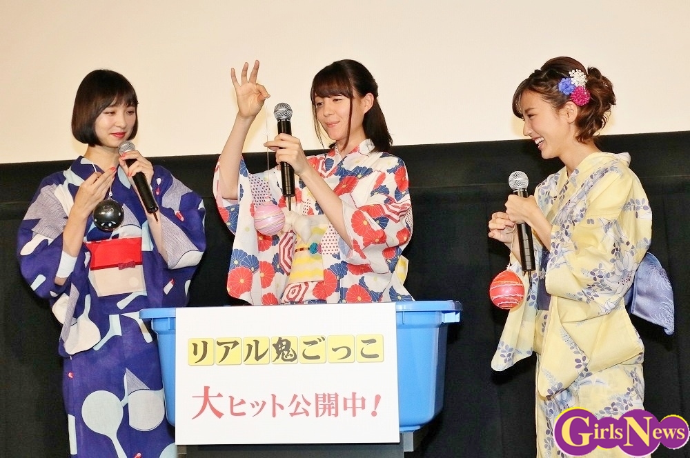 7月25日、公開中の映画「リアル鬼ごっこ」の大ヒットを記念した舞台挨拶付き夏祭りイベントが新宿ピカデリーで行われ、トリプルヒロインで主役を務めたトリンドル玲奈さん、篠田麻里子さん、真野恵里菜さんが夏らしく美しい浴衣姿で登壇した。