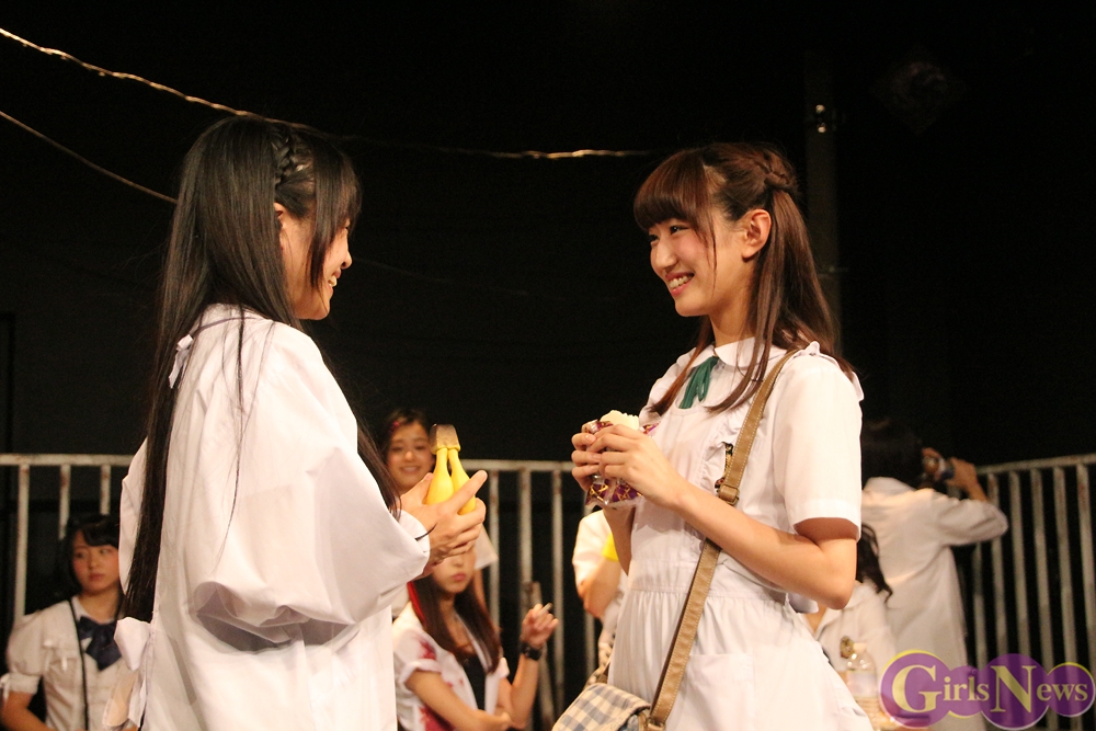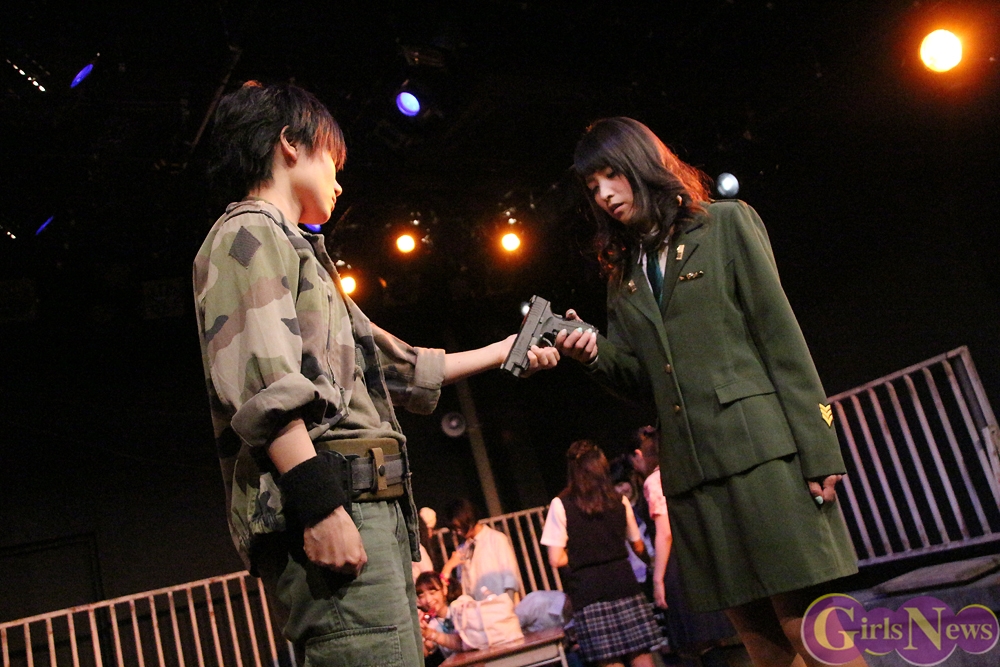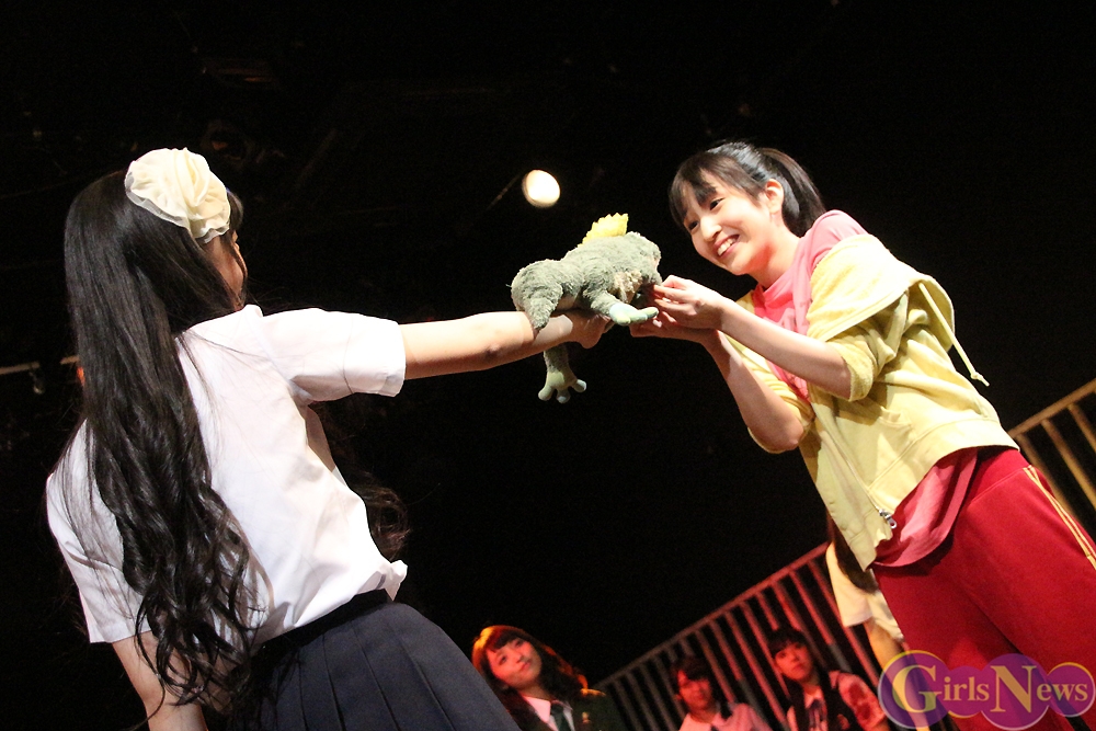 今回は舞台セットも特筆すべき点で、以前の会場より狭いステージにもかかわらず、細部まで作りこまれたリアルさがスケール感をかもし出している。先日、アリスインアリスのメンバーとして、TOKYO IDOL FESTIVALのSKY STAGEで実際の屋上でライブを行った花梨さんは「SKY STAGEでは、ゆずゆずさんの卒業でみんなで抱き合って大泣きしましたが、外なので景色がきれいでよかった。この舞台の屋上はほんとに汚いですね(笑)。カビとか砂とかもあって、ホントの学校みたいです。」と感心していた。