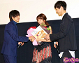 続いて山﨑賢人さんと坂口健太郎さんから花束をプレゼントされ、桐谷美玲さんは「やるねぇ。みなさんと一緒に大好きなこの映画を作れたことをよかったと思っています。」と感謝していた。