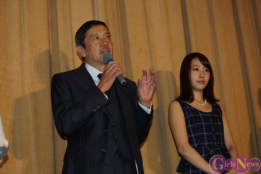 松坂慶子、草村礼子、奥田瑛二とベテラン俳優が次々と舞台に登壇する中、1人アイドルグループ NMB48のメンバーである藤江れいなさんが登壇。客席には応援グッズを手にした藤江れいなさんのファンが多数駆けつけ声援を送る。