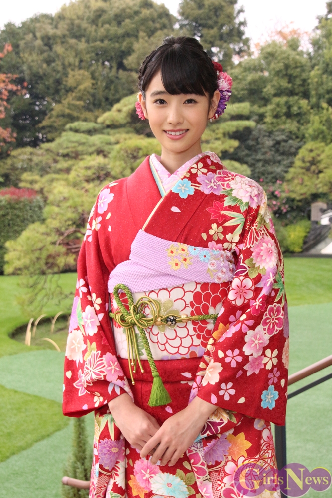 高橋ひかるさんは振り袖について「メインの赤色が鮮やかでお花の模様もあってすごく綺麗ですね」と満足そう。撮影会に出席した感想を「去年同様に大先輩と並んですごく緊張しましたが、一員になれて嬉しい」と喜んだ。