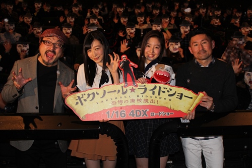 『ワイドナショー』(フジ系)などにも出演し注目される女子高生女優・岡本夏美さんが、日本初の4DX(R)専用映画『ボクソール★ライドショー 恐怖の廃校脱出!』で主演。公開初日の16日、都内にて行われた記念の舞台挨拶に、共演の渡辺恵伶奈さん、大迫茂夫さん、白石晃士監督とともに登壇した。舞台挨拶では、映画上映の際使われている4DXの機能をキャストたちが観客とともにリアルに体感し盛り上がった。