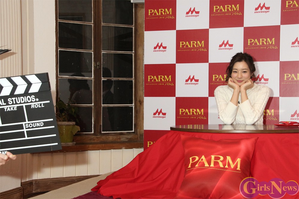 2月3日、女優の足立梨花さんがCMキャラクターを務める森永乳業のチョコレートアイスバー『PARM(パルム)」のPRイベント「妄想コタツドラマ上映&コタツデート実演会」が六本木の撮影スタジオで行なわれた。