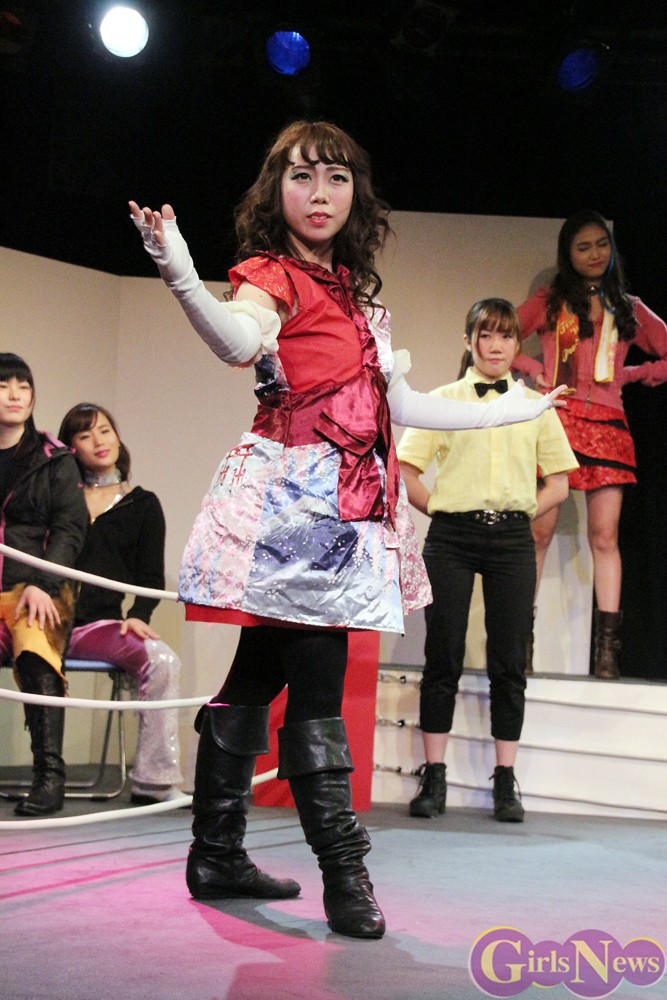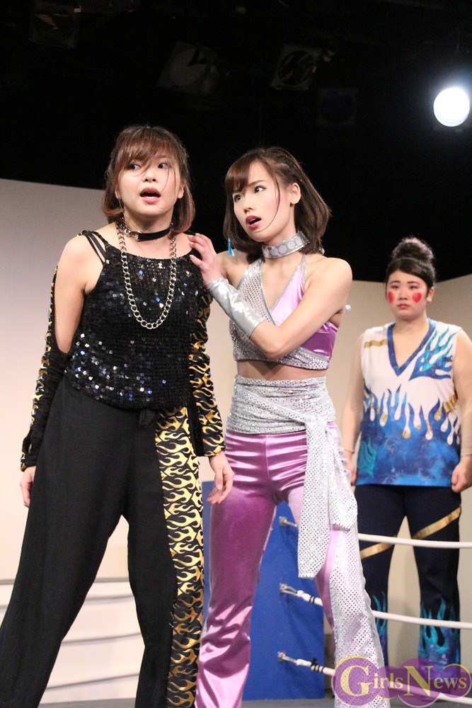 椎名「シェイクスピアの悲劇ですけれど、女子プロレスとして女の子だけで演じている舞台なので、他にはない作品に仕上がっていると思います。前回は演出家さんが振りを付けてくださったのですが、今回は本物の女子プロレスの人が付けてくれたので、作品としてパワーアップしました。私は今回はレスラーでなくてトレーナー役ですが、SM感がある人になっていて個人的にもパワーアップしているなと思います」