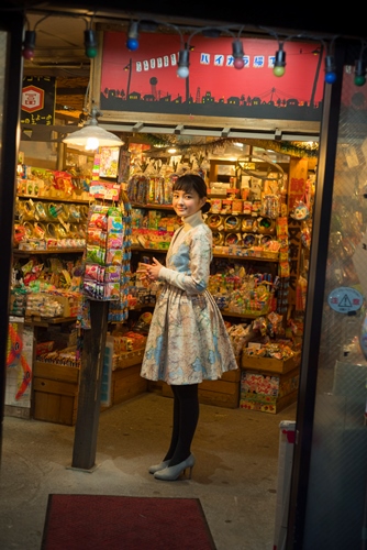 葵さんは「私が日本的で渋いものが好きなので、ロケ地は“和”の雰囲気のあるシチュエーションにしたくて東京の下町で撮影しました。駄菓子がすごく好きなので、駄菓子屋での撮影はわくわくしたし、一番気に入っているシチュエーションです」と撮影を振り返る。