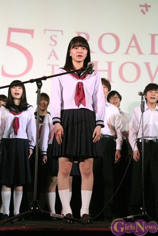 舞台挨拶の最後には合唱部員22名とともに『桜ノ雨』を披露して、会場いっぱいに歌声を響かせた。合唱を終えた山本さんは胸をなで下ろすと「ホントにいい歌なので、毎回いつも泣きそうになります。このメンバーで歌えたからこそ、いい作品ができた。本当にすばらしい作品になっているので、自信を持って観てくださいと言えます」と胸を張った。