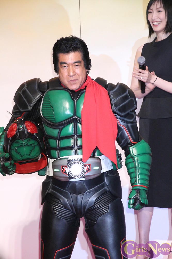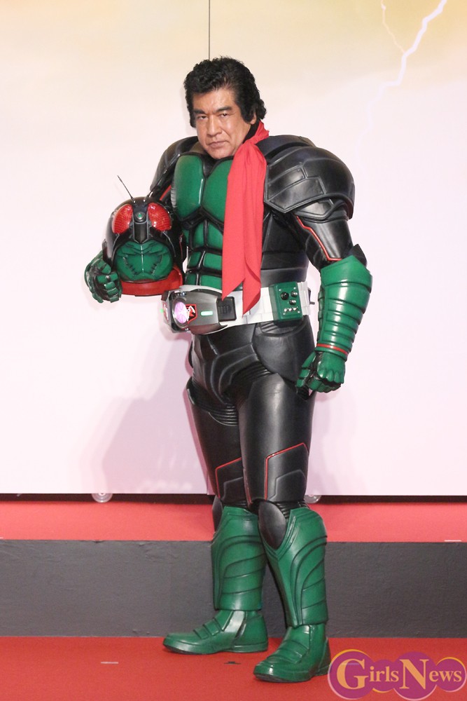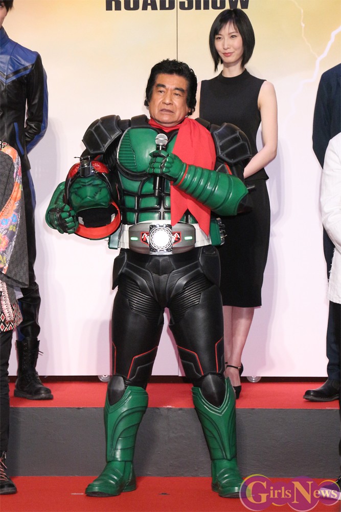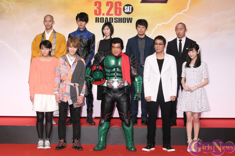 誕生45周年記念超大作映画『仮面ライダー1号』(3月26日公開)の完成披露イベントと舞台挨拶が15日、新宿バルト9で行なわれ、44年ぶりに仮面ライダースーツに身を包んだ藤岡弘、をはじめ、共演者の岡本夏美、阿部力、長澤奈央、武田幸三、大杉漣、西銘駿、大沢ひかる、山本涼介、柳喬之が顔を揃え、伝説のヒーローの復活を盛大に盛り上げた。