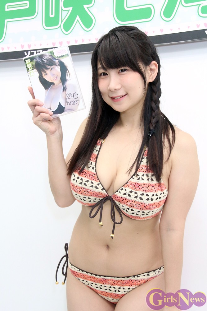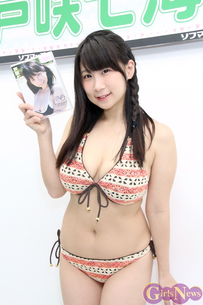 100cmのHカップを誇る巨乳グラドル・戸咲七海さんの新作DVD『ミルキー・グラマー』の発売イベントが20日、秋葉原・ソフマップアミューズメント館で行われた。