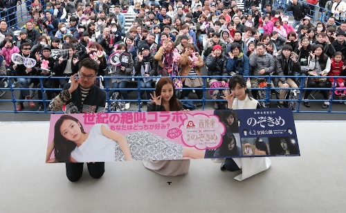 板野友美さん初主演映画『のぞきめ』と富士急ハイランドのタイアップ企画“絶叫コラボキャンペーン”の記念イベントが21日、山梨・富士急ハイランドにて行われ、板野さん、入来茉里さん、三木康一郎監督が登壇、板野さんによる映画主題歌『HIDE & SEEK』の披露や、映画にまつわるトークショーを繰り広げた。