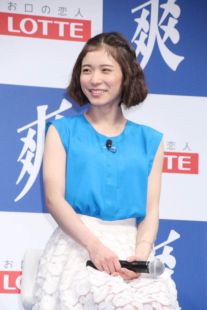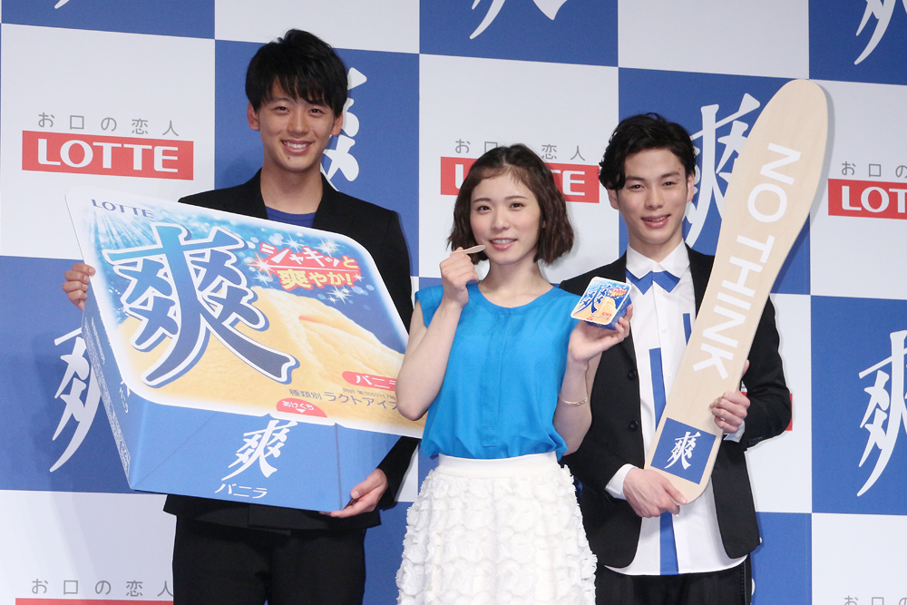 女優の松岡茉優が、この春から放送されるロッテアイス『爽』の新CMキャラクターに決定し、共演する竹内涼真、柾木玲弥と共に、22日に都内で行われた記者発表会に出席した。