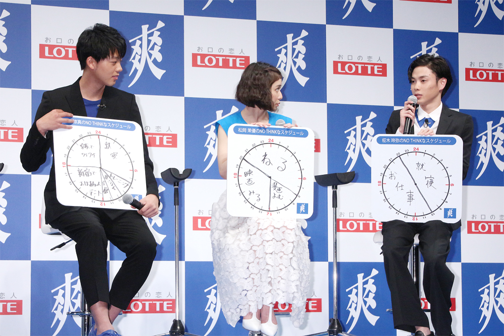 イベントでは、新CMのコンセプトでもある「NO THINK そーハッピー」にちなんで「頭を空っぽにしたい理想の一日」をそれぞれが発表した。竹内さんは「字が小さすぎる」と松岡さんに指摘されるほど細かいスケジュールを書いたのに対し、松岡さんは半日寝て、あとは漫画と映画のDVDを見て過ごすというシンプルさ。柾木さんに至ってはさらに「就寝・仕事」とだけ書かれており、周囲から「頭を空っぽにするのに仕事?」と聞かれると「役者の仕事をしているときが、煩わしいことを考えなくて済むので」答えて、他の2人から感心されていた。
