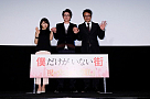 映画『僕だけがいない街』の“大ヒット御礼舞台挨拶”が24日、東京・丸の内ピカデリー1にて行われ、主演の藤原竜也、有村架純、平川雄一朗監督が登壇。作中カメラマンを志すヒロイン役を演じた有村さんが、報道陣とともに舞台上の藤原さんを撮影し、場内を盛り上げた。またトークタイムでは有村さんは女優を目指していた高校生の頃のエピソードも明かした。