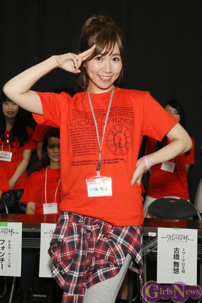 加藤智子(時空刑事プレア役)「時空警察学校の先生役なので説明のシーンがあるのですが、私がコケちゃうと話の軸が判らなくなるのでしっかり説明したい。銃の名手でもあるのですが、クリームパンみたいなカワイイ銃でカッコいいアクションをしているので、注目して欲しい」