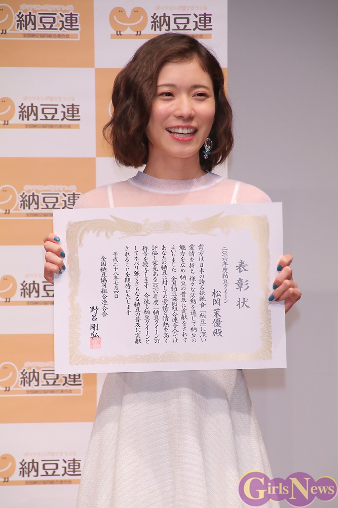 7月10日の「納豆の日」を前に2016年度「納豆クイーン」が女優の松岡茉優さんに決まり、お披露目となる表彰式が4日、東京・銀座の時事通信ホールで開催された。