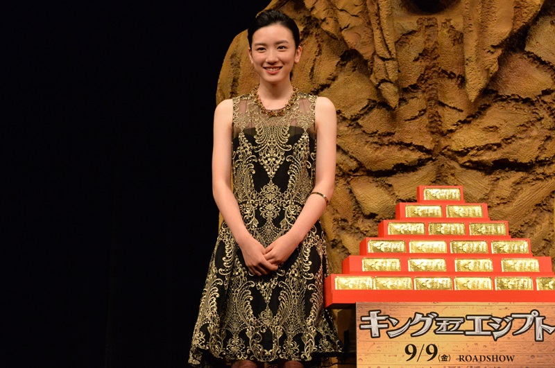 それぞれ映画をイメージした衣装で登場した二人。玉森さんは「ゴールドの衣装は恥ずかしい…」と言いつつも、ファンからの「似合っているよ!」の言葉に得意げな表情を浮かべていた。永野さんは「こんなに上品にキラキラしたものは初めて。背筋が伸びる思いです」と笑顔をみせた。さらに劇中にも登場し、玉森さんと永野さんの登壇を待ち構えていた巨大スフィンクについて永野さんが「気を失いそう」と感想を漏らすと、「近くで見ると怖い。すごい迫力ですね。」と続けた。