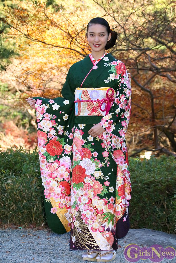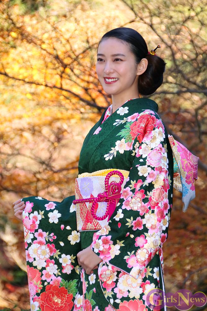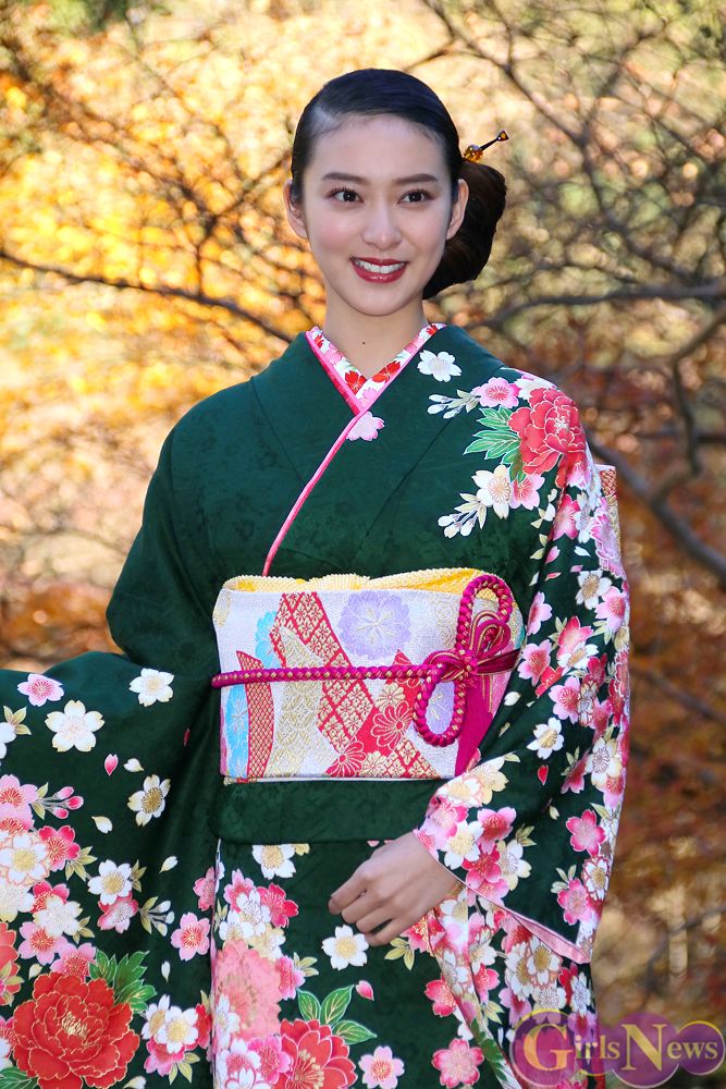 武井咲さんは深みのある緑色の着物を着て「これまで赤とかが多かったので、こういうクラシカルなお着物を着られて、とても新鮮です」とアピール。「2,016年はたくさんの作品に恵まれて、幅広くお芝居ができたとても恵まれた1年でした。来年は体調管理に気をつけて、さらに頑張りたいです」と語った。