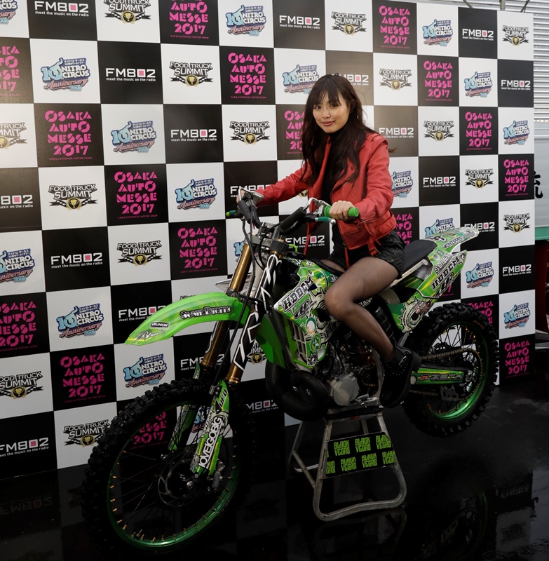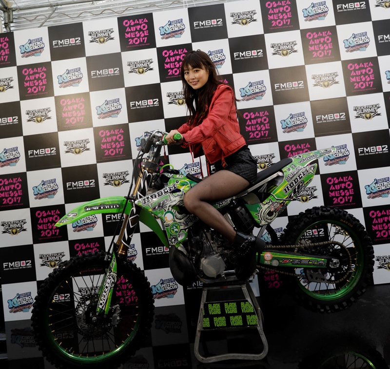 そして今回リクエスト通り、真っ赤なライダースジャケットに黒のホットパンツと網タイツ姿で登場。普段の愛くるしいイメージとは一変、ワイルドでセクシーな姿に会場にいた人達の目は釘付けに。内田さんは「ナイトロ・サーカス、バイクといえばライダースだ!と思って選びました!」と語り、ナイトロへの思いの強さがうかがえた。