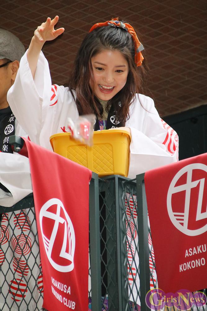 会見後には法被を着た4名が劇場のバルコニーに登場し、地元住民や観光客らで賑わう通りに餅まきを行なった。