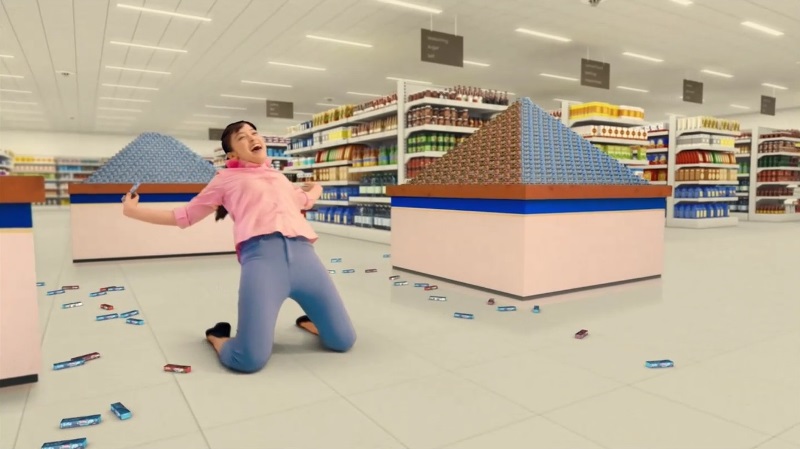 CMストーリーの舞台はとあるスーパー。音楽をバックに、橋本さんがカートを勢いよく押し出して軽やかにステップを踏み、くるりとターンしながら店内を移動、そして橋本さんがぷっちょをひと口食べると、妄想が広がる。