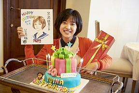 「プリンシパル」「YUINA HAPPY BIRTHDAY」とデコレーションされた赤いプレゼントBOX型のバースデーケーキ、イラストと一緒に笑顔で記念撮影。最後には、力強く「ありがとうございました!」と感謝の気持ちを伝え、撮影現場での 20 歳の誕生日を締めくくった。