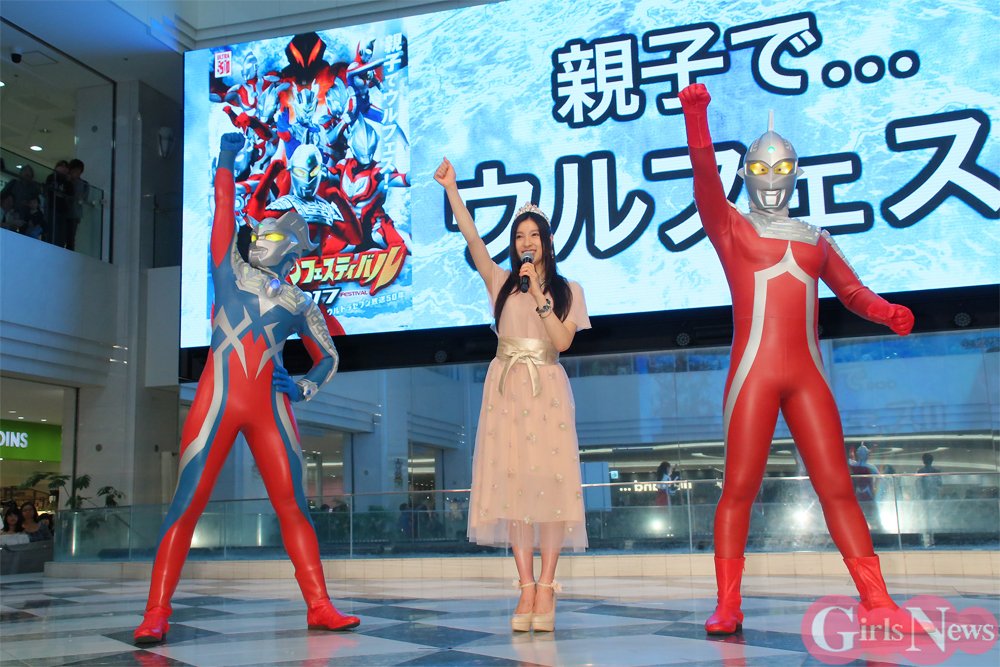 ステージでは、ウルトラセブンとウルトラマンゼロの親子ヒーローと、セブンに登場する代表的な怪獣のキングジョーとメトロン星人のバトルアクションも繰り広げられ、間近で観ていた土屋さんは迫力に驚きながら「怖かったけど、救っていただいて幸せです」とホッとした表情で答えた。