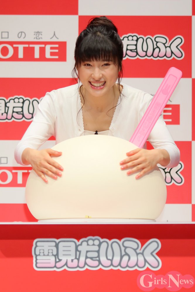 昨年に引き続き雪見だいふくのイメージキャラクターを務める土屋さんの新CMは「日常の節目の〆に雪見だいふく」というコンセプト。発表会で特大の雪見だいふくの形をした印を押して「〆雪見」をアピールした土屋さんは、さらに「〆」の形をポーズで表現し、発表会の〆に、すっかり得意芸となった「餅のばし」を披露した。