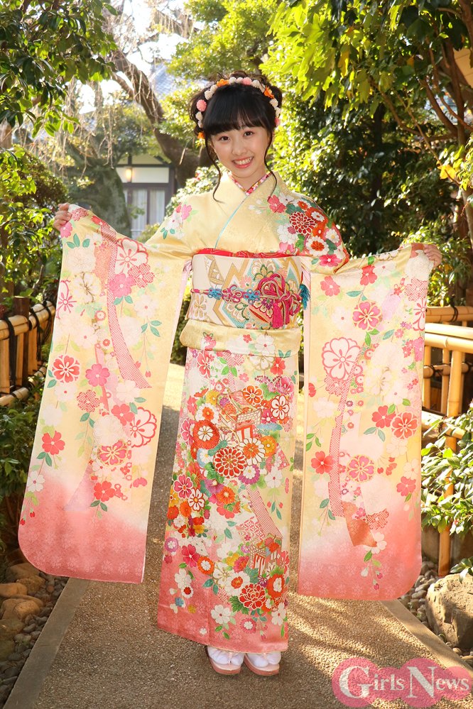 最初の頃は七五三用の着物だったのが、去年から大人用を着られるようになって、全体に黄色やピンクの可愛らしい色なんですが、お花の色合いとか大人な感じもして嬉しいです。ヘアアレンジもお花が飾ってあって、キレイだなって、ぼーっと鏡に見とれちゃいました。