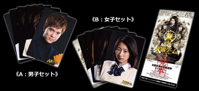 映画版の前売鑑賞券の特典の「人狼ポストカードセット《A:男子セット》《B:女子セット》」は、映画『人狼ゲーム インフェルノ』で命がけの人狼ゲームに参加する高校生を演じる主演の武田玲奈さんほか10名のキャストと、高校生たちを監禁したゲームマスター側の人物と思われる謎の男を演じるBOYS AND MENの水野勝さんの特写カットを使用。男性キャストのみ6枚組、女性キャストのみ6枚組の2種類から選ぶことができる。