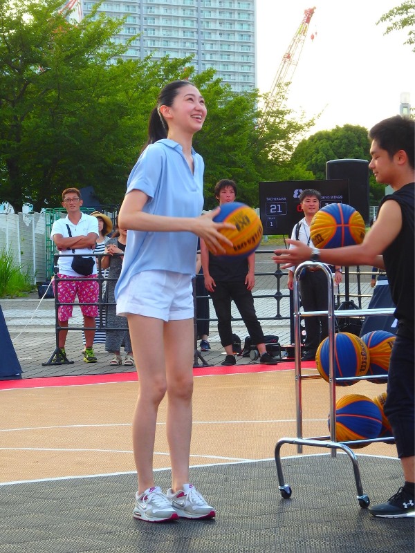 フォーラム後には3×3バスケのエキシビションマッチも行われ、是永さんも試合観戦し、フリースロー大会のデモンストレーションにも参加した。