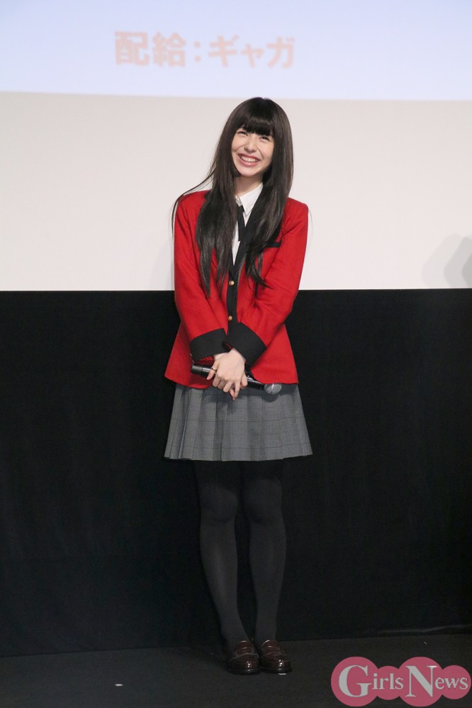 学園に転校してきた謎多き少女・蛇喰夢子を演じる浜辺さんは、劇中の制服姿で登壇した。本作のお気に入りのシーンについて、早乙女芽亜里(演:森川葵)と結託してギャンブルに勝ったシーンを挙げ、「それまで敵対していた早乙女さんと初めて協力して戦ったゲーム。普段のチームワークが出せて撮影が楽しかった」と紹介した。