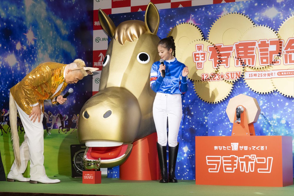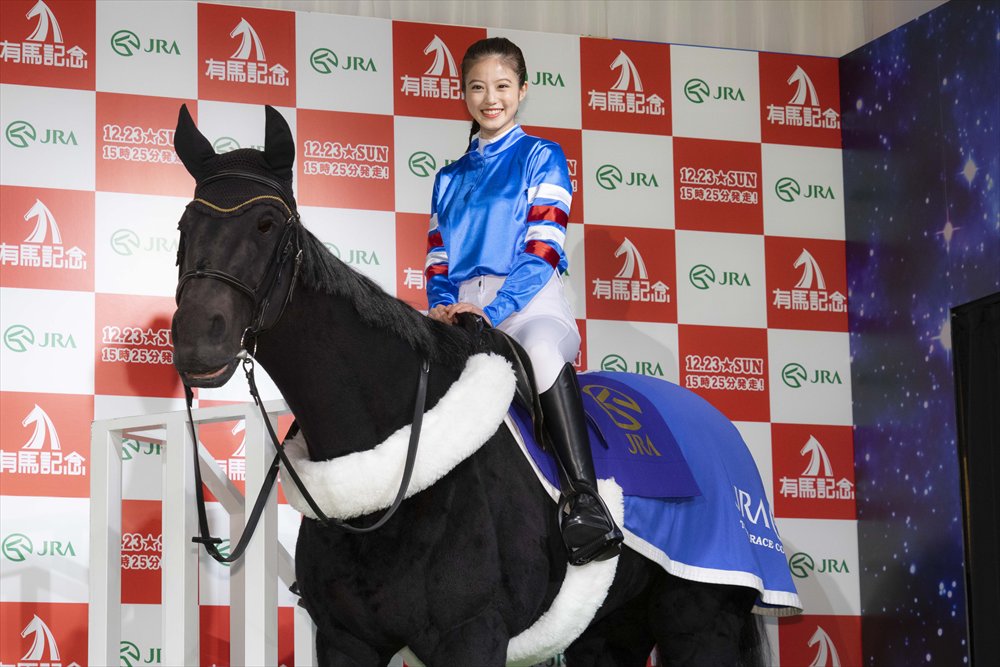 ステージでは、巨大な馬型抽選器「うまポン」のお披露目が行なわれたほか、、勝負服(ジョッキー姿)風の衣装に身を包んだ今田さんは実物の馬にそっくりな「馬ロボ」の騎乗も体験した。