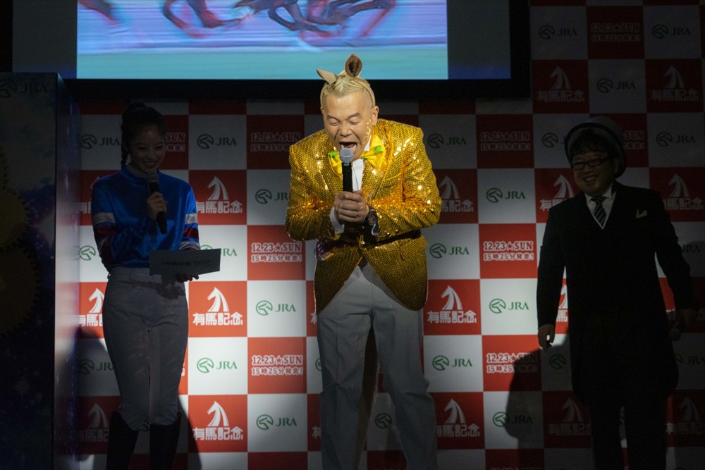 さらに、今田さんとウド鈴木さんは「ディープインパクト」が優勝した平成18年の有馬記念の映像に合わせたレース実況にもチャレンジした。レース実況に初挑戦の今田さんは、慣れないながらも、“さすが女優!”という実況ぶりで、ディープインパクト優勝のシーンを盛り上げ、会場からの拍手喝采となった。一方、ウド鈴木さんはアドリブ満載の“迷”実況を披露し、こちらも会場をわかせた。