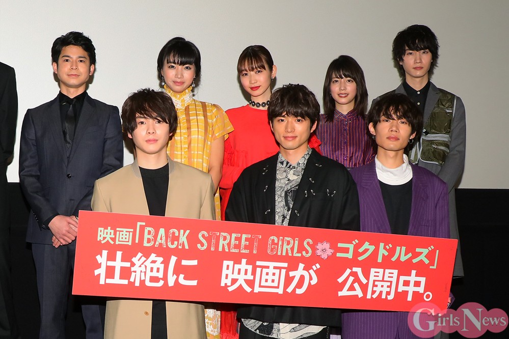 ゴリゴリのヤクザが性転換をしてアイドルになってしまうという、ぶっ飛んだ原作コミックを実写化した映画『BACK STREET GIRLS-ゴクドルズ-』の公開記念舞台挨拶が9日、新宿バルト9で行われ、白洲迅、花沢将人、柾木玲弥、岡本夏美、松田るか、坂ノ上茜、菅谷哲也、桜田通、原桂之介監督が登壇した。