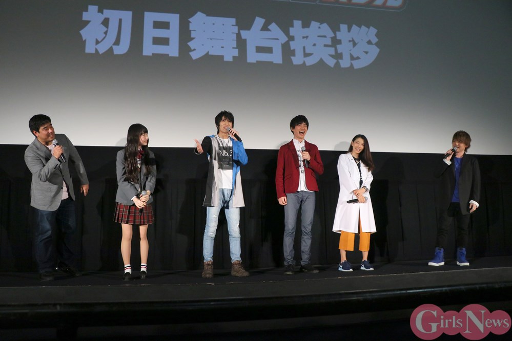 会場の温かい拍手に迎えられた湊カツミ役の平田さんは「昨晩は遠足の前日のようにワクワクしていました。これからたくさんの人に観ていただけるのがうれしい」と挨拶。イサミ役の小池さんが「朝から観てくださった方がツイッターで感想を書いてくれて初日を実感した。良い感想をつぶやいて欲しい」と話すと其原さんは「いよいよ初日が開けたので早くみなさんの感想が聞きたい。私もカツ兄と同じでワクワクして寝れなかったです」と笑顔を見せた。