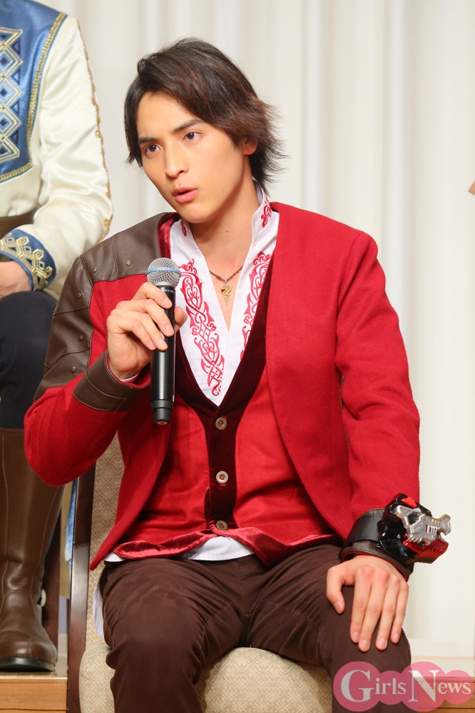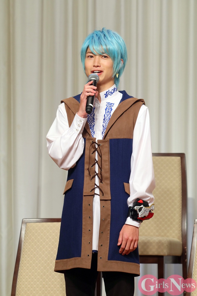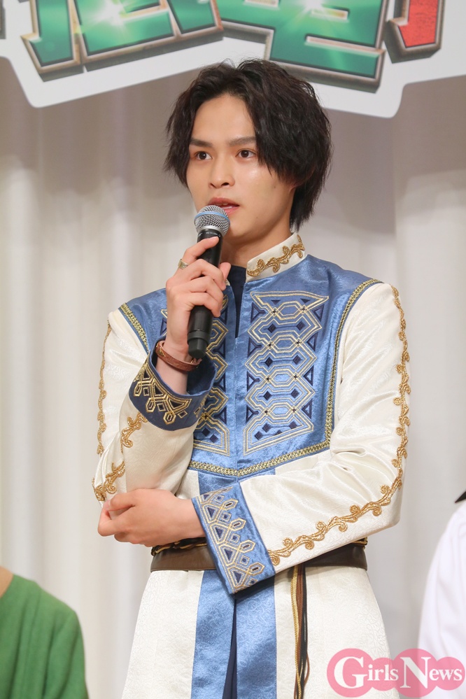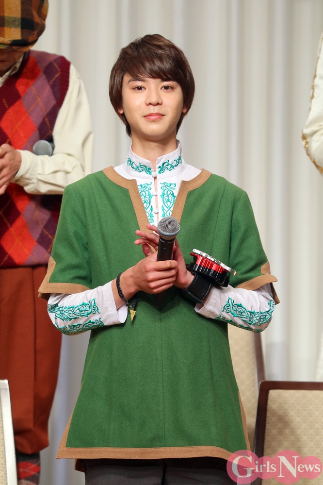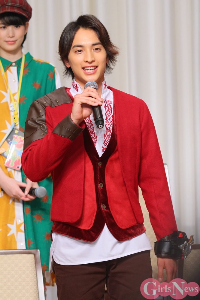 リュウソウレッド/コウ役の一ノ瀬颯さんは会場を埋め尽くす報道陣を前に緊張しまくり。周囲からも「落ち着いて!」と励まされて「これでも成長したんですけど」 と照れまくった。「6500万年前と現代を行き来する壮大なスケールのストーリーと、映画にふさわしい迫力満点の戦闘シーン、僕たちの熱い演技が見どころになってます」と作品をアピールした。