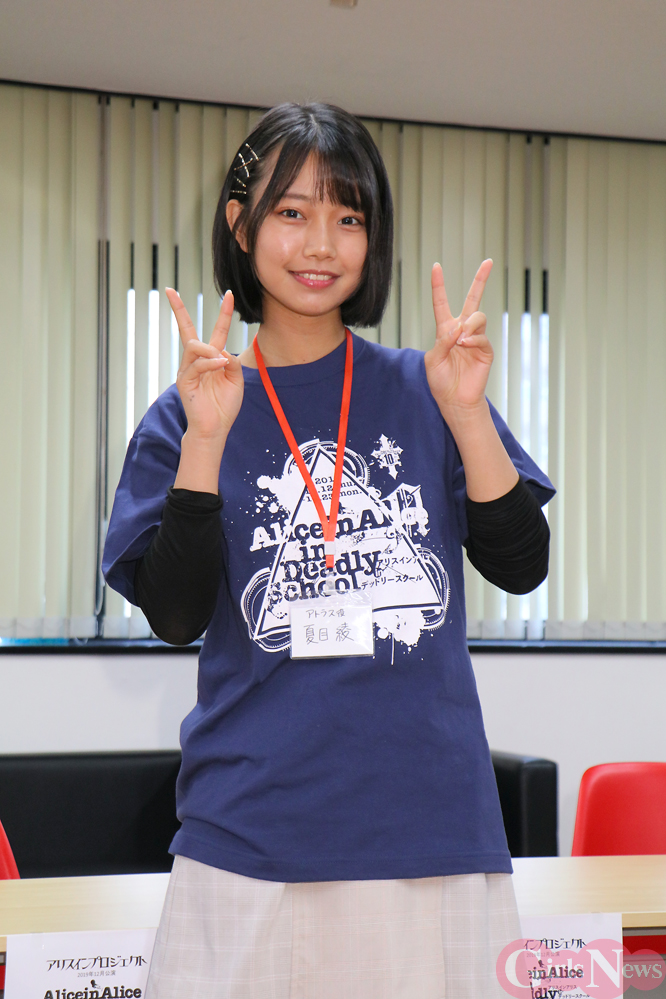 夏目綾(アトラス)「今回が初舞台なんですが、精いっぱい頑張ります」と緊張しがちに挨拶。「アトラスは、アリスインアリスのトレーサーの一員で、時空を移動できる存在です。私は初心者なので、みなさんが稽古をしているのをスゴイなと思って見ながら、私も見習って頑張ろうと思います。見どころは、私自身とは正反対にドンとしているところをみせたいと思います」