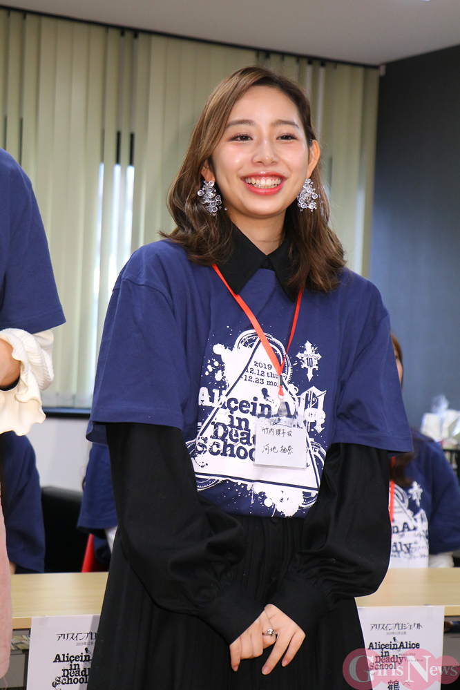 渡邉結衣(黄市恵美)「14歳で最年少なのですが、アリスインプロジェクトさんの舞台が初めてで、ビジュアル撮影とか、みんなと一緒にダンスの稽古をしたりとか、本当にたくさん初めてのことがあって、緊張ですごいドキドキしていたんですけれども、先輩方がみんな本当に優しくしてくださっています」