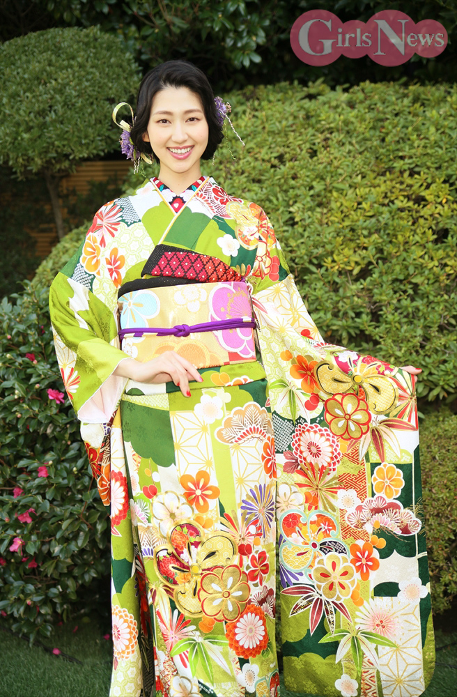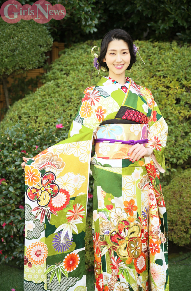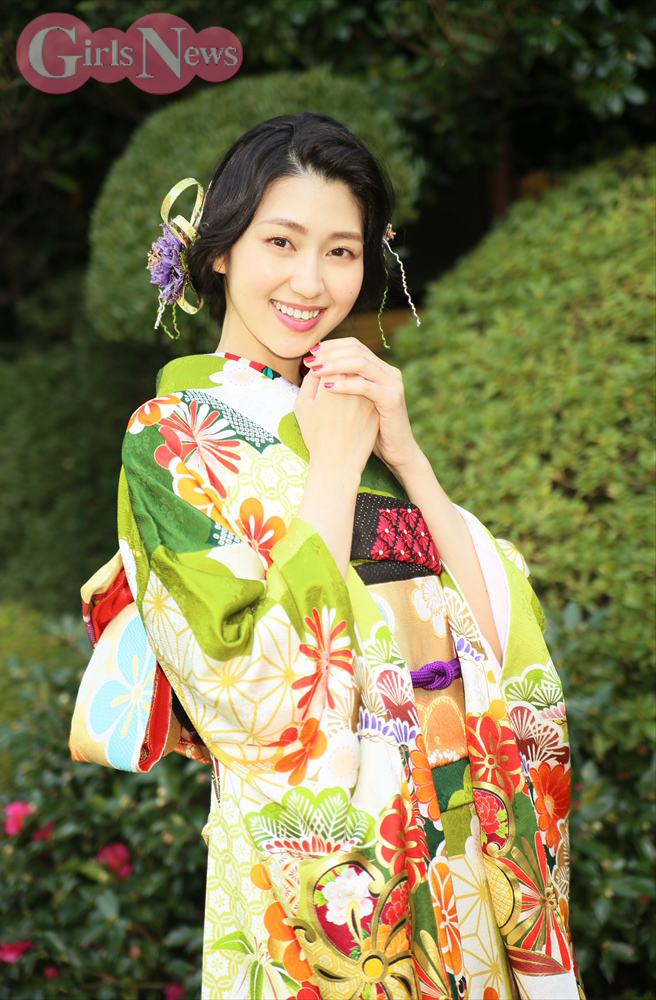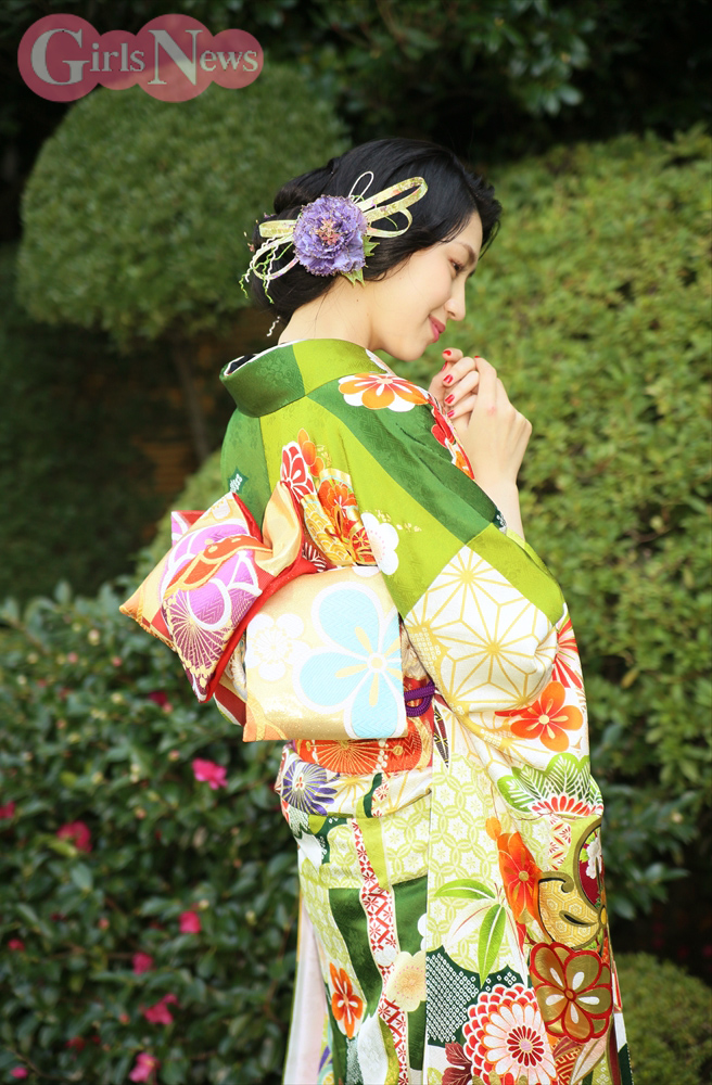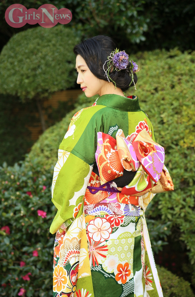 「晴れ着撮影会に参加するのは今年で4年目になるんですけれども、緑を着させていただくのは初めてで、すごく新鮮な気持ちです。今日のコーデのポイントはこの髪飾りで、母が作ってくれたものなんです。今日のために作ってくれていたようで『晴れ着撮影会に今年も出るよ』って報告したときにすごく喜んでくれました。このような形で親孝行ができたかなって思うのと、また母からもらった大切なものが一つ増えたなと言う気持ちで、胸が熱くなりました」
