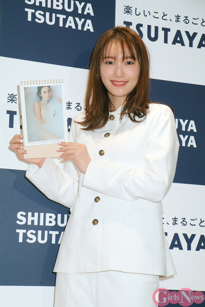 卓上型カレンダーとしてはやや大きめの、写真集のようなカレンダーを「触れたくなるような質感を大切に撮影しました」と紹介。お気に入りは8月のバスタブに入った写真で、「いつもは肌を出すのに抵抗があるんですけど、透け感を意識しました」とアピール。さらに「太ももでお花を挟んだり、お花と体のパーツを撮ってコラージュしたり。いやらしくない、きれいにおしゃれにを目標にしました」と説明した。