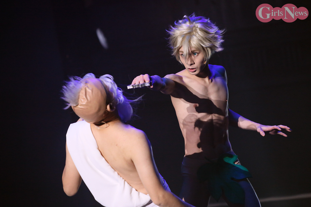 それぞれが、原作から抜け出たような衣装を身にまとっているが、アダム役の大平峻也さんはほぼ全裸。イヴ役の新谷姫加さんは「ビジュアル撮影まで衣装を知りませんでした。アダムを見たときに“えっ?”と思ったので、自分には布があって安心しました」と笑っていた。