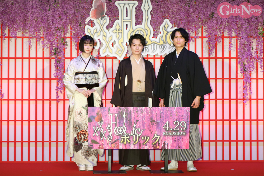 人気マンガ原作の映画『ホリック xxxHOLiC』(29日公開)の大ヒット祈願イベントが14日、東京・神田明神にて行われ、神木隆之介、松村北斗、玉城ティナの出演者が取材会に出席した。