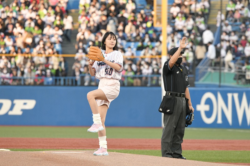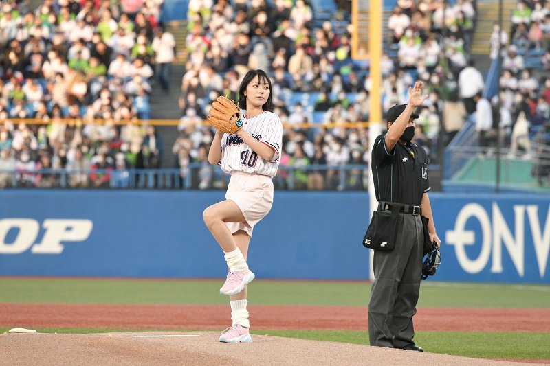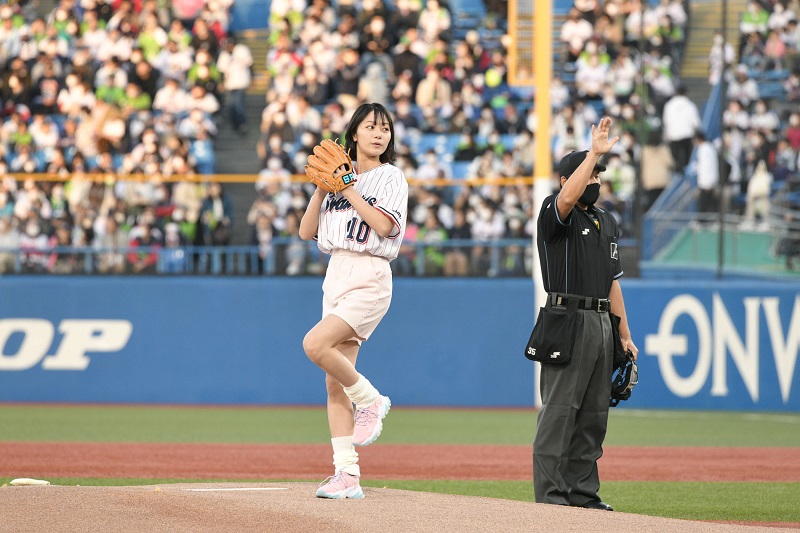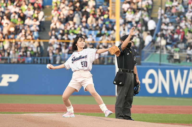そして迎えた始球式。投げた直後に⼤きく 1塁側に球が外れゴロとなってキャッチャーの内山壮真選手のミットにおさまった。「練習では上手く⾏っていたのに…。⼒んで 1 塁側に(球が)⾏ってしまいました 。気持ちよく投げたつもりでしたが……」と笑った。球団マスコットのつば九郎からも「なんだ︕この始球式は⁉」と叱られたそうで苦笑いを浮かべた。