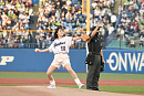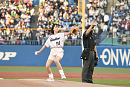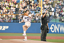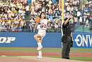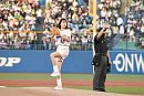 自身 5 回目となる始球式。これまで納得のいく投球ができなかったということで、家族ぐるみで仲良しというヤクルトOBの川崎憲次郎氏からアドバイスを受け、入念に練習して当日に備えたという。