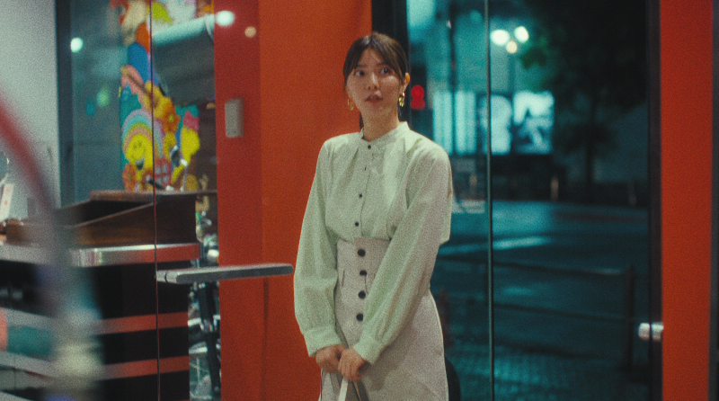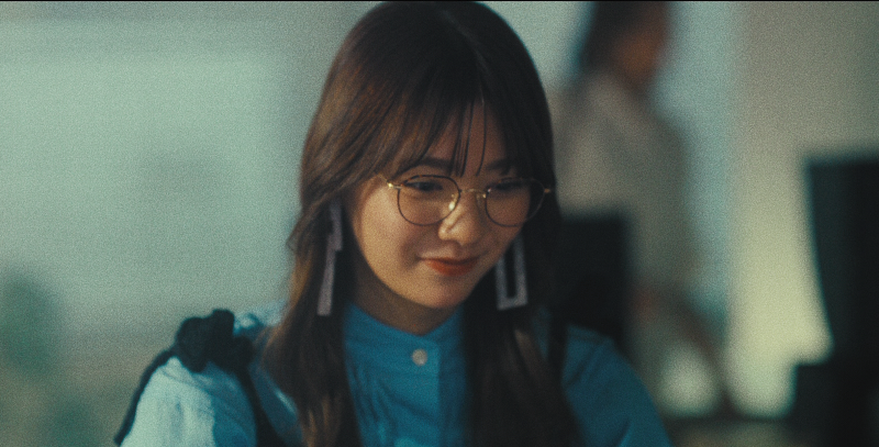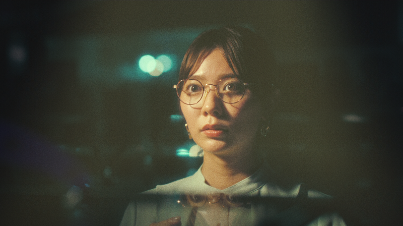 川津明日香さん演じる女性は、オフィスで一人残業をしている様子。オフィスを出た後、バスで隣に座る男性の肩に頭を乗せ眠ってしまい、気まずい雰囲気に。バスから降り少し疲れた表情で歩いていると、メガネ店が現れ、吸い込まれるように店内へ。ほかにお客さんはおらず、自由にメガネを見てそのうちの一つを手に取り、かけてみることに。突然周りの電気が消え、女性にスポットライトが当たる。