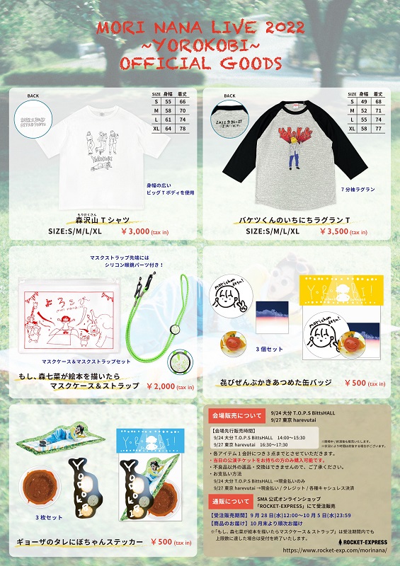 女優で歌手の森七菜さんが9月24日、地元・大分にて初ワンマンライブ『もりななLIVE 2022 「㐂〜よろこび〜」』をスタート。大分公演、そして27日の東京公演の各会場にて販売されるオフィシャルグッズとその絵柄が公開された。