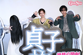 撮影で貞子に扮したという小芝さんは「めっちゃ、テンション上がりました!」と喜び、「人っぽくない動きをどういう風に表現したらいいんだろうとか、ターゲットを狙って歩いて近づいてはいるけど、あんまり目がキョロキョロしてると人っぽくて嫌だなとか、いろいろ考えながら演じました」と述懐。「でも、空き時間はずっとこうやって踊ってました」と貞子の動きを真似るように踊っていた。