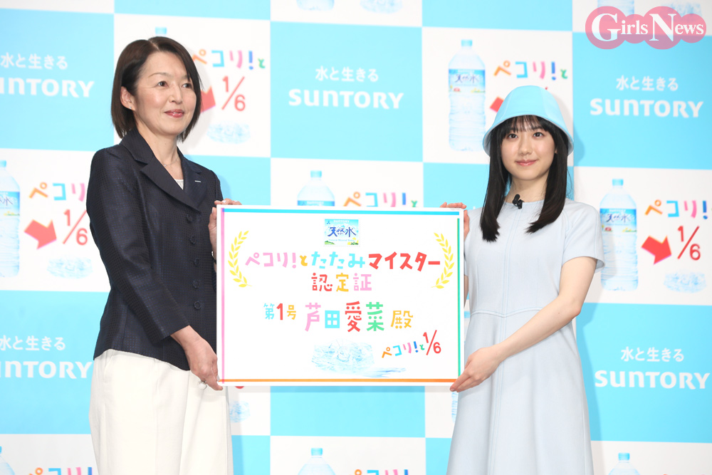 会見で芦田さんは取材陣の前で『天然水2L ペコリ!とたたみマイスター検定』に挑戦。見事に楽しくわくわくとペットボトルを折りたたむと、第1号の認定証を受け取ってニッコリ。