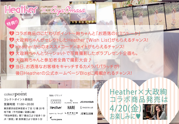 このイベントではコラボ商品の紹介や大政絢さんの普段のおしゃれについてのトークショー、2ショット撮影などを予定。抽選で350名様を招待しイベントが開催される。詳しい応募方法の詳細はHeatherのブランドサイトをチェックしてください。